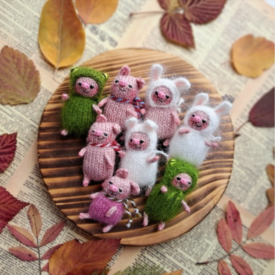 Размер свиней на фотографиях 6,5-7 см. В мастер-класс также входят описание шапочек зайца и лягушки. Мастер-класс в формате pdf файла. Видео нет.